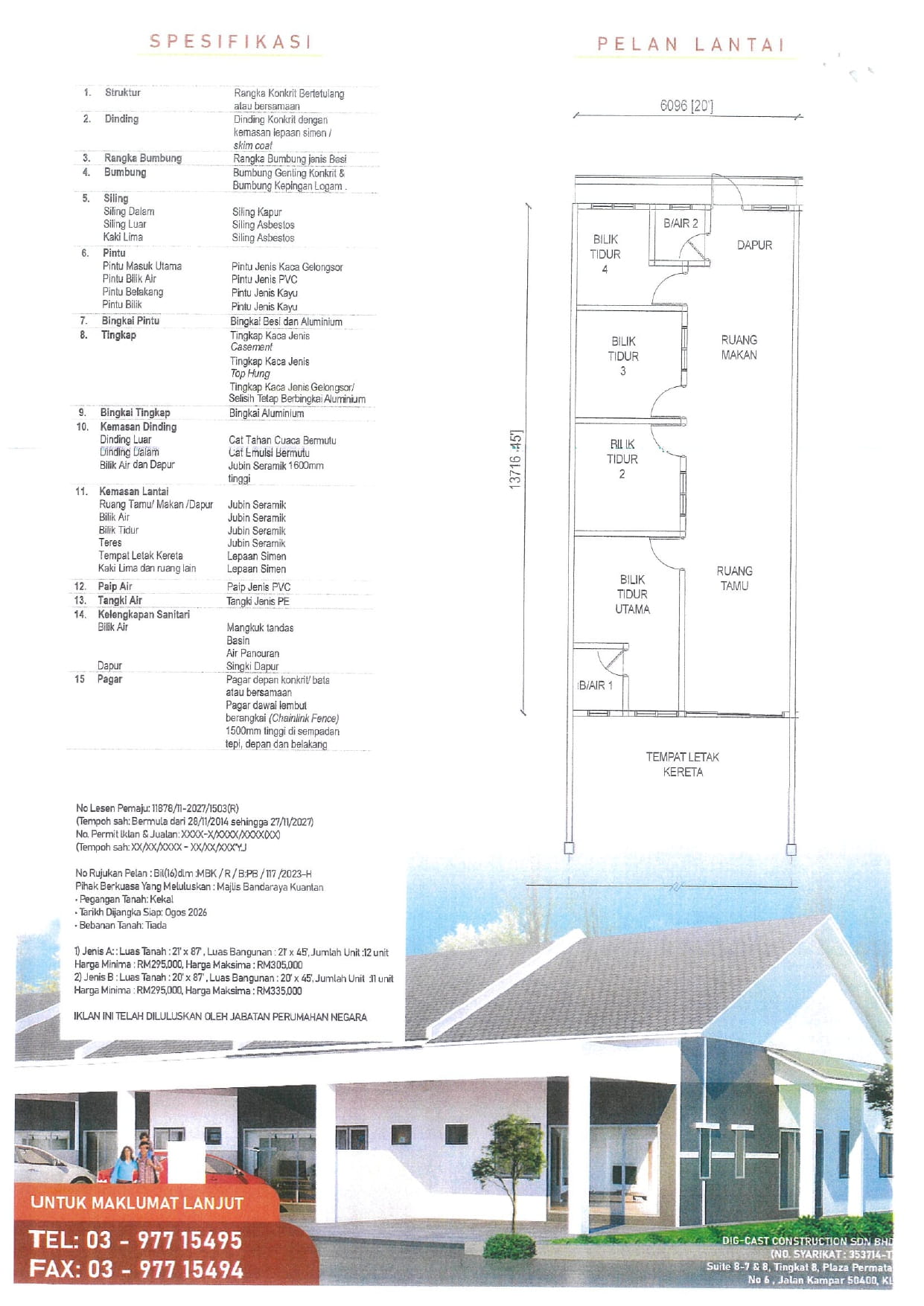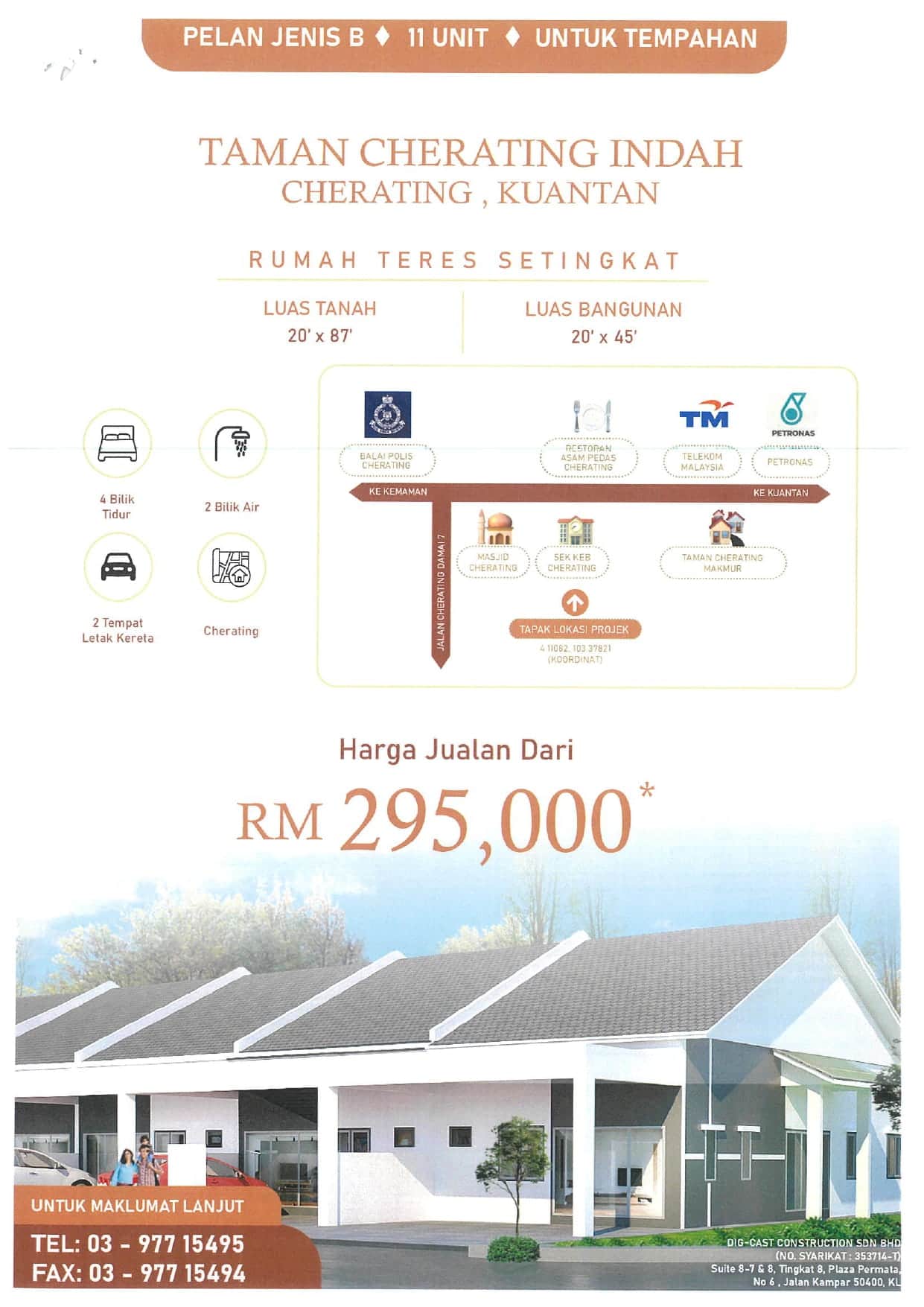 TAMAN CHERATING INDAH Cherating, Kuantan Pemaju: DIG-CAST CONSTRUCTION SDN BHD Rumah Teres Setingkat Jenis AHarga Jualan Dari RM 295,000(Maksimum RM 305,000)Jenis BHarga Jualan Dari RM 295,000(Maksimum RM 335,000)Bilik Tidur4Bilik Tidur4Bilik Air2Bilik Air2Keluasan Tanah21′ x 87′Keluasan Tanah20′ x 87′Luas Binaan21′ x 45′Luas Binaan20′ x 45′Jumlah Unit12Jumlah Unit11 PROGRES PEMBINAAN August 2024 Februari 2025 Mac 2025 Mei 2025 Untuk spesifikasi terperinci, hubungi Eksekutif Pemasaran kami sekarang! Hubungi Kami Sekarang